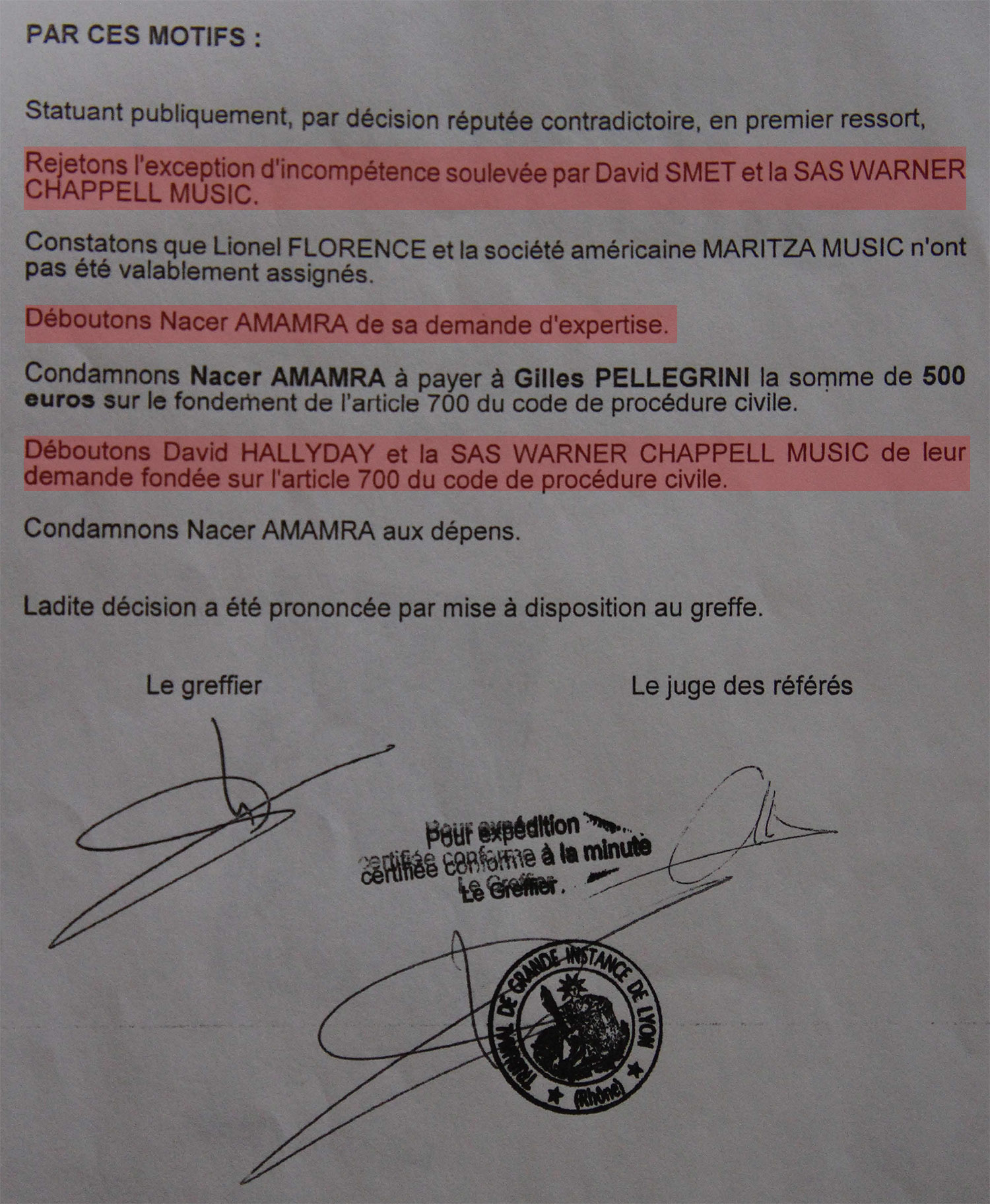 En effet, cet extrait de l’ordonnance du juge explique que le demandeur (Nacer Amamra) avait fait établir une analyse comparative des deux oeuvres concernées, qui recense tous les points de similitude existant entre elles et que la mesure d'instruction (une enquête), avant tout procès pour mettre en avant des points de similitudes des deux oeuvres concernées est inutile car selon Madame Chifflet, un plagiat musical est perceptible à l'audition.